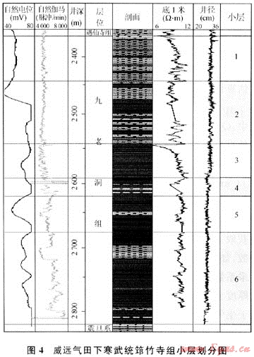 容積法估算中,依據(jù)威遠(yuǎn)氣田區(qū)筇竹寺組巖性和電性特征(圖4),在圖3基礎(chǔ)上,將威遠(yuǎn)氣田區(qū)筇竹寺組劃分為6個(gè)小層(見(jiàn)表4)。