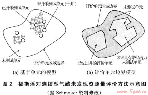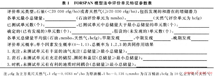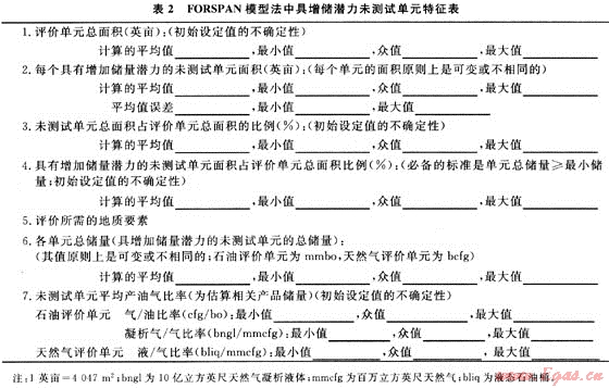福斯潘模型(FORSPAN)法是USGS在1999年為連續(xù)型油氣藏資源評(píng)價(jià)而提出的一種評(píng)價(jià)方法。該方法以連續(xù)型油氣藏的每一個(gè)含油氣單位為對(duì)象進(jìn)行資源評(píng)價(jià),即假設(shè)每個(gè)單元都有油氣生產(chǎn)能力,但各單元間汗油氣性(包括經(jīng)濟(jì)性)可以相差很大,以概率形式對(duì)每個(gè)單元的資源潛力作出預(yù)測(cè)。以往也用體積法對(duì)連續(xù)型油氣藏資源潛力作過(guò)評(píng)價(jià)。在體積法中,原始資源量估算常用的參數(shù)主要是一些基本地質(zhì)參數(shù)(如面積、厚度、孔隙度等),這些參數(shù)有很大的不確定性,且各單元間關(guān)系密切、缺乏獨(dú)立性。因此,參數(shù)選取及標(biāo)準(zhǔn)確定較困難。福斯潘(FORSPAN)法建立在已有開(kāi)發(fā)數(shù)據(jù)基礎(chǔ)上(圖2),估算結(jié)果為未開(kāi)發(fā)原始資源量。因此,該方法適合于已開(kāi)發(fā)單元的剩余資源潛力預(yù)測(cè)。已有的鉆井資料主要用于儲(chǔ)層參數(shù)(如厚度、含水飽和度、孔隙度、滲透率)的綜合模擬、權(quán)重系數(shù)的確定、最終儲(chǔ)量和采收率的估算。如果缺乏足夠的鉆井和生產(chǎn)數(shù)據(jù),評(píng)價(jià)可依賴各參數(shù)的類比取值。