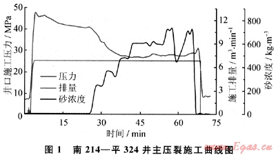由于炮眼磨損引起的施工壓力變化在限流法壓裂施工曲線中有很明顯的顯示,圖1是南214-平324井的主壓裂施工曲線,從圖中可以看出支撐劑到達(dá)井底后,井口壓力大幅度下降,這在其他壓裂方式中是沒有的現(xiàn)象。此現(xiàn)象是由于支撐劑加入引起的混砂液凈液柱壓力、管柱摩阻和孔眼摩阻的變化綜合作用的結(jié)果。根據(jù)南214-平324井的井身結(jié)構(gòu)及施工情況定量計(jì)算出前兩項(xiàng)的值[6~7],可以發(fā)現(xiàn)它們對施工壓力的影響遠(yuǎn)沒有這么大,因此可以判斷出現(xiàn)施工壓力如此大幅度降低的主要原因是孔眼受支撐劑打磨孔徑變大后,摩阻急劇降低造成的,但目前的壓裂設(shè)計(jì)軟件還不能模擬孔眼摩阻的動態(tài)變化對裂縫形態(tài)的影響。