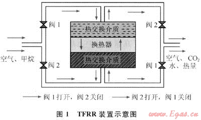 開始運行時,電熱元件對熱交換介質(zhì)進行預(yù)熱,使之達到反應(yīng)所需要的溫度。一個循環(huán)包括兩次風(fēng)流轉(zhuǎn)向,每一次轉(zhuǎn)向稱為一個半循環(huán)。在第一個半循環(huán)中,甲烷和空氣的混合物以常溫通入反應(yīng)器,閥1打開,閥2關(guān)閉,風(fēng)流從反應(yīng)器頂部流向底部,當(dāng)空氣和甲烷的混合物到達熱交換介質(zhì)時發(fā)生氧化反應(yīng),放出熱量。產(chǎn)生的熱量及反應(yīng)產(chǎn)物持續(xù)通過反應(yīng)器的出口,出口處的熱交換介質(zhì)不斷吸熱,從而溫度不斷升高。而入風(fēng)側(cè)因風(fēng)流以常溫通過,熱交換介質(zhì)不斷被冷卻,當(dāng)冷卻到一定溫度時,反應(yīng)器自動轉(zhuǎn)換風(fēng)流方向,進入第二個半循環(huán)。風(fēng)流從高溫側(cè)進入,并吸收熱交換介質(zhì)的熱量,從而達到自燃溫度。反應(yīng)生成的熱量,一部分被熱交換器吸收,另一部分用于補償熱損失,從而往復(fù)循環(huán)。