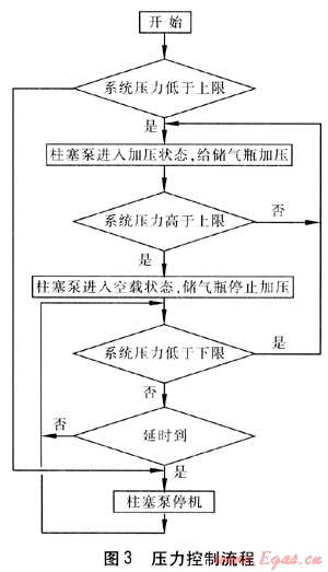 壓力控制是通過控制柱塞泵的工作狀態(tài)和工作時間,使儲氣瓶中CNG的壓力穩(wěn)定在上限和下限之間,圖3是壓力控制流程。