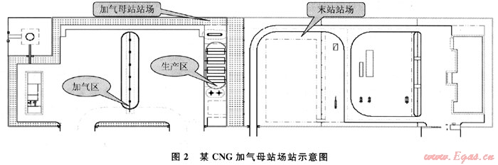 南京某CNG加氣母站設計規(guī)模為20×104m3/d,進站壓力為4.2~5.88MPa,溫度為17.2~22.5℃。該加氣母站分為生產區(qū)(壓縮機4臺,3用1備)、加氣區(qū)(6臺加氣柱)、站場值班室和停車區(qū)4個部分,如圖2所示。