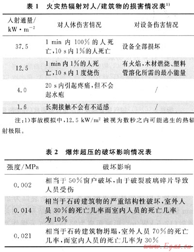 火災熱輻射對人/建筑物的損害情況見表1。