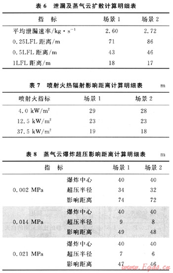 各場景泄漏、擴散、火災和蒸氣云延遲爆炸的計算結果見表6~8。