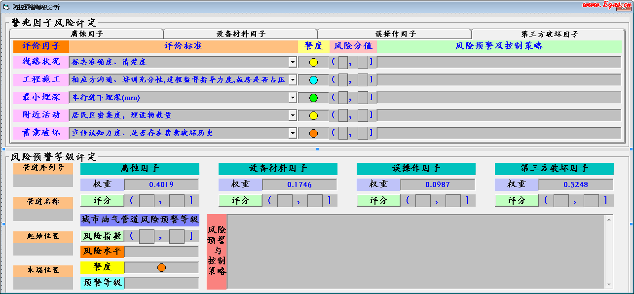 根據(jù)評(píng)價(jià)因子中所羅列的因素,在對(duì)應(yīng)評(píng)價(jià)標(biāo)準(zhǔn)下拉菜單中選擇符合實(shí)際現(xiàn)場(chǎng)管道情況后,軟件自行判斷其對(duì)應(yīng)的警度、風(fēng)險(xiǎn)分值、風(fēng)險(xiǎn)預(yù)警及控制策略,各評(píng)價(jià)因子的風(fēng)險(xiǎn)評(píng)定結(jié)果如圖 8—11所示。 風(fēng)險(xiǎn)評(píng)定之后,依據(jù)改進(jìn)的肯特(W.Kent)管道風(fēng)險(xiǎn)評(píng)價(jià)方法(piperiskmanagementmanual),參考著名油氣儲(chǔ)運(yùn)專家潘家華教授提出的風(fēng)險(xiǎn)模型,結(jié)合城市油氣管道風(fēng)險(xiǎn)現(xiàn)狀,給出各風(fēng)險(xiǎn)評(píng)定因子的權(quán)重分配,計(jì)算每個(gè)評(píng)定因子的評(píng)分錄入預(yù)警等級(jí)分析界面(如圖 12所示),再計(jì)算出最終該管道的評(píng)分區(qū)間為(5,7),對(duì)照城市油氣管道相對(duì)風(fēng)險(xiǎn)指數(shù)警度分級(jí)表得出預(yù)警等級(jí)為高風(fēng)險(xiǎn)巨警,并給出相應(yīng)的防控策略。