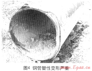 另外,施工單位應(yīng)有回拖時(shí)卡管情況下的應(yīng)急預(yù)案,龍大高速穿越卡管發(fā)生在第三塊孤石處,此時(shí)只需稍微后拉一下的擾動(dòng),再重新回拖時(shí)就可能錯(cuò)過卡點(diǎn)。由于管道浮在泥漿中,這是不難做到的,而一味強(qiáng)拖則會(huì)越卡越緊。由于施工單位沒有合適的應(yīng)急預(yù)案,結(jié)果發(fā)生卡管時(shí)應(yīng)對(duì)失當(dāng),先是長(zhǎng)時(shí)間停泵使泥漿干涸凝固,而后又在沒有鉆機(jī)有效引導(dǎo)情況下,用夯管錘暴力全程強(qiáng)夯,結(jié)果管段偏離管孔前行,導(dǎo)致鋼管塑性變形嚴(yán)重超標(biāo)(圖4)。
