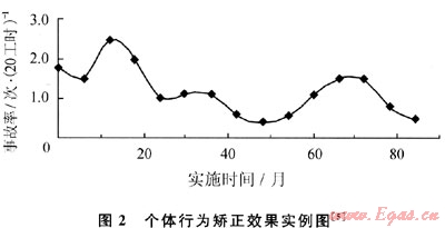 目前,行為科學(xué)在現(xiàn)代安全管理科學(xué)中日益受到重視,研究成果取得有效的收益。實(shí)驗(yàn)表明,在個(gè)體行為矯正方法的實(shí)施過(guò)程中,由于員工不安全行為的減少,事故率呈周期性下降趨勢(shì)(圖2)[5]。根據(jù)海因里西(Heinrich)事故三角形可知,即使是輕微事故的減少,也會(huì)對(duì)預(yù)防重大事故的發(fā)生產(chǎn)生重要意義。