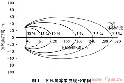 在LNG場站選址時,需要遠離居民區(qū),以保證人民生命財產安全,因此,場站與居民區(qū)之間的距離是重要的考慮因素。LNG在泄漏過程中,自泄漏源開始,氣體濃度逐漸被稀釋,當其體積濃度在5%~15%范圍內(即甲烷的爆炸極限內),存在發(fā)生火災或者爆炸的可能性。為了確保間隔距離劃定的可靠性,相關標準(如NFPA59A),規(guī)定其下風向體積濃度為2.5%處的距離為安全距離[4]。以Burro系列5號實驗為例(以下簡稱B5),其下風向上體積濃度的等濃度線見圖1,可以看出下風向體積濃度5%和2.5%的最大距離差約為110m。以下用所建的計算模型,對氣體擴散過程和安全距離的影響因素進行分析。