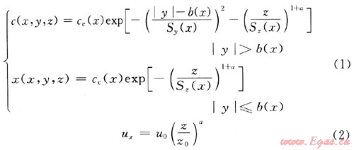 連續(xù)泄漏模型又稱穩(wěn)態(tài)模型,即下風向云團內部的各種性質參數只是位置的函數。DEGADIS作為積分模型,假設氣體擴散濃度在側風向上采用修正的高斯分布,而豎直方向上采用指數分布,并且對風速分布做了假設,其表達式如下: