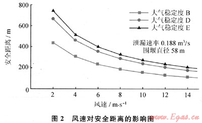 所建立的LNG泄漏氣體擴散模型計算方法,經過實驗驗證,其平均偏差為24.28%,并較準確地體現了重氣擴散過程中云團內部特性的變化規(guī)律。對于穩(wěn)態(tài)LNG氣體擴散,當風速大于2m/s時,隨著風速的增加,安全距離是逐漸減小的;對于較小風速(小于2m/s)時,該穩(wěn)態(tài)模型將不再適用。泄漏速率增大使安全距離幾乎成比例增大,是影響安全距離最重要因素之一。對于給定的LNG泄漏率,圍堰尺寸變化對安全距離的影響會呈現出一個弱峰,之后安全距離會隨圍堰尺寸的增加而略有減小。