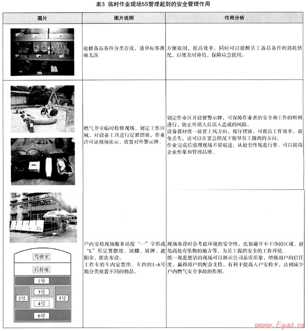 燃?xì)馄髽I(yè)是沒有“圍墻的工廠”,存在很多臨時作業(yè)場所。如:井室搶維修作業(yè)、戶內(nèi)安檢作業(yè)等。相對來說這些臨時性作業(yè)場所不穩(wěn)定因素較多,現(xiàn)場的安全控制更加重要。通過0HSAS18001我們可以識別了存在的風(fēng)險、制定了安全措施和作業(yè)管理流程、以及應(yīng)急預(yù)案等,如果和5S現(xiàn)場定置管理結(jié)合起來,可以取得更好的成效。見表3: