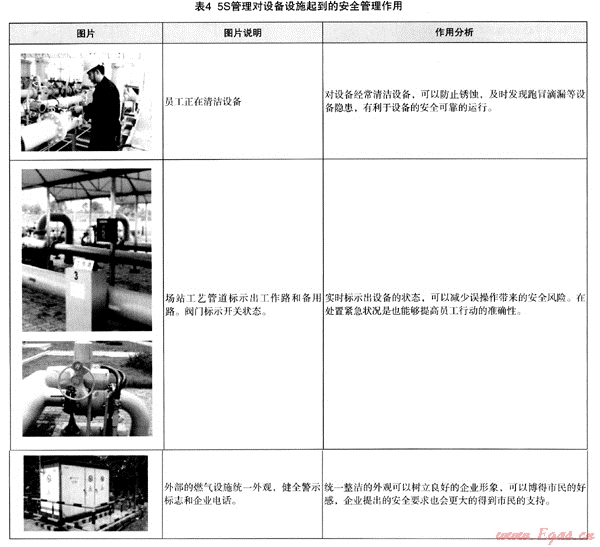 3.2.2燃?xì)庠O(shè)施遍布全市,不僅是場站之內(nèi)的設(shè)備設(shè)施,更多的中、低壓燃?xì)庠O(shè)施分布于全市各處公共場所。設(shè)備設(shè)施的安全可靠是企業(yè)安全管理的重要內(nèi)容。企業(yè)除了通過0HSAS18001制定出各種巡查、維護、保養(yǎng)工作規(guī)定和流程外,5S的目視管理,可進一步增強設(shè)備的安全可靠性。見表4: