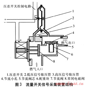 流量信號的獲取可以有多種途徑,比如可以通過燃氣表,也可以設(shè)置專門的流量傳感器獲取流量信號。對于大流量的泄漏,普通的流量檢測方法就可以了,但有些泄漏是很微量的,比如接頭的松動、膠管的老化等,普通的流量檢測方法很難滿足。能夠檢測微小流量的流量傳感器其流通能力也一定是很小的,如果將其安裝在管道上,必然在正常使用的流量下形成很大的阻力,因此需要找到一種既能檢測微小流量,又不會造成較大阻力的流量檢測裝置。流量開關(guān)信號采集裝置很好地解決了這個問題,其結(jié)構(gòu)見圖3。