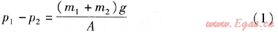 將此裝置安裝在燃氣管道的上游,使壓差開關(guān)的高壓信號取壓管及低壓信號取壓管分別與常閉電磁閥的前取壓管和節(jié)流閥芯的后取壓管相連。壓差管道開關(guān)的開閉信號輸出給控制電路,再由控制電路控制常閉電磁閥的啟閉,決定是否切斷燃氣,實現(xiàn)保護。設(shè)定燃氣入口壓力為p1,燃氣出口壓力為p2,壓差開關(guān)設(shè)定的動作壓差分別為△p1和△p2。當壓差開關(guān)左右腔壓差上行到p1-p2>△p1時,壓差開關(guān)控制電路導(dǎo)通;當壓差開關(guān)左右腔壓差下行到p1-p2<△p2時,壓差開關(guān)控制電路斷開。氣流與節(jié)流閥芯接觸面積為4,節(jié)流閥芯的質(zhì)量為m1,配重塊的質(zhì)量為m2。下面根據(jù)流量大小兩種情況進行分析。