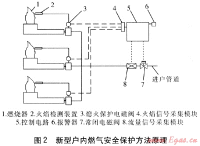 任何管道泄漏都必然會有流量,但有流量并不一定是泄漏。流量分正常流量和非正常流量,非正常流量主要是泄漏造成,也有可能是偷氣、人為放散等。無論是什么原因,非正常流量都是我們所要禁止的。對于正常流量,由于城鎮(zhèn)燃氣都是用于燃燒提供熱能的,而燃氣在燃燒時,必然同時存在著火焰、流量兩種信號,因此只有同時存在這兩種信號,才能認定此時的流量信號為正常的,如果只有流量信號而沒有火焰信號,那一定是管道泄漏等非正常流量所造成的。如果我們根據(jù)這一基本原理設(shè)計一個安全系統(tǒng),則可以保證對泄漏等非正常流量進行切斷,或者只允許正常流量通過控制閥門,就可從根本上保證燃氣的安全使用?;谏鲜鲈淼膽魞?nèi)燃氣安全保護方法原理見圖2。