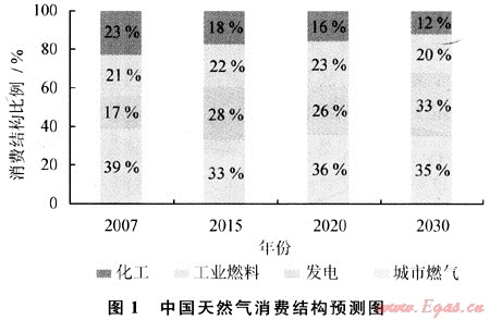 2) 城市燃氣、CNG等將成為天然氣主要利用領域。結(jié)合中國天然氣工業(yè)發(fā)展歷程和天然氣消費結(jié)構變化趨勢,預計今后中國的天然氣利用方向首先是滿足城市燃氣、CNG等需求;其次是以氣代油、以氣代煤作為工業(yè)生產(chǎn)的燃料,以改善不斷惡化的大氣環(huán)境;天然氣發(fā)電具有效率高、清潔環(huán)保等優(yōu)勢,許多國家積極發(fā)展,中國受到資源和天然氣發(fā)電經(jīng)濟性影響,將適度發(fā)展,以優(yōu)化電源結(jié)構。據(jù)統(tǒng)計,中國283個地級市及以上城市中約有188個已經(jīng)用上天然氣,2008年城市燃氣消費量在300×108m3左右,受國民經(jīng)濟發(fā)展及城市化進程影響,預計到2020年將超過1600×108m3,年均增長9.8%。車用CNG因其獨有的經(jīng)濟與環(huán)保優(yōu)勢,將得到持續(xù)發(fā)展。以小型汽車為例,CNG汽車與汽油車相比每百公里節(jié)省燃料費60%左右。而且CNG汽車較普通燃油汽車維護維修費用下降約40%,發(fā)動機壽命延長2~3倍,可減少50%的機油用量,經(jīng)濟效益非常明顯。資料研究結(jié)果顯示,與汽油車相比,CNG汽車可減排一氧化碳97%、二氧化硫90%、碳氫化合物72%、氮氧化物39%、二氧化碳24%、粉塵100%。2008年,全國CNG汽車保有量約25萬輛,全國約有近700座CNG加氣站,銷售天然氣約30×108m3。根據(jù)歷年CNG汽車增長速度測算,2010年CNG需求量在60×108m3左右,2015年將超過100×108m3。到2020年全國CNG需求量將可能超過500×108m3(其中川渝地區(qū)將提前達到50×108m3)[3]。未來中國的天然氣消費結(jié)構預測如圖1所示。