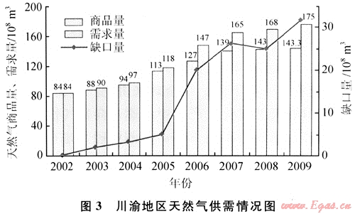 2002年,市場基本能維持平衡,但隨著天然氣市場的快速發(fā)展,各行業(yè)、各部門對其的需求量急速增長,導致市場供需缺口越來越大,市場平衡的任務愈加繁重。到2009年,市場缺口已經(jīng)高達30×108m3,如圖3所示。