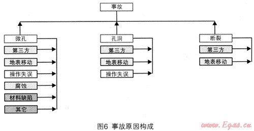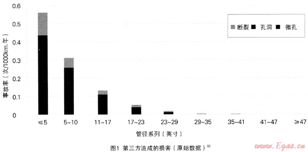 需要強調(diào)的是這些管道事故的統(tǒng)計,管道壓力≥1.5MPa,包括管徑DN 100mm以下的管道。在管道事故統(tǒng)計的分類辦法中,按管徑分類可以方便的把統(tǒng)計結(jié)果應(yīng)用于其它地區(qū)各管徑系列管道的風(fēng)險分析。