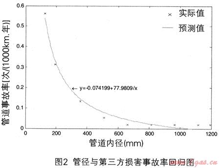 摘要:定量化和精細化管理是企業(yè)發(fā)展的必由之路,燃氣企業(yè)老的管理模式是從事故到事故的被動搶修模式,新的管理模式是以風(fēng)險預(yù)評判為基礎(chǔ)的無事故預(yù)防型管理。風(fēng)險預(yù)評判只有建立在定量分析的水平上,才能真正具有系統(tǒng)性、精確性和預(yù)見性,所以管道事故數(shù)據(jù)的獲取和分析是定量風(fēng)險評估方法建立、改進和完善的基礎(chǔ)?;诨貧w分析的方法預(yù)測管道事故率,事故率為因變量,自變量可以有很多種(管道內(nèi)徑、管道埋深、管壁厚度等),本文以管徑為自變量從而分析出遞變性的規(guī)律,從最具普遍性的損害原因(第三方損害)著手,借鑒國外(歐洲)燃氣管道事故統(tǒng)計資料和分析方法,得出管道事故率回歸方程,體現(xiàn)影響因素與管道事故率之間的函數(shù)關(guān)系。