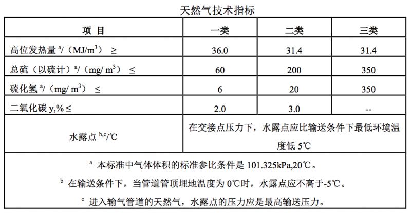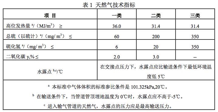 GB50028《城鎮(zhèn)燃氣設(shè)計規(guī)范》2006中對天然氣的質(zhì)量進行了規(guī)定:天然氣發(fā)熱量、總硫和硫化氫含量、水露點指標應(yīng)符合現(xiàn)行國家標準《天然氣》GB17820的一類氣或者二類氣的規(guī)定。