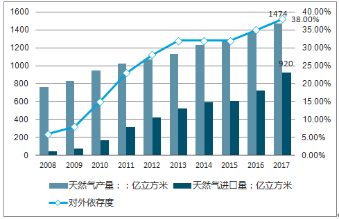 2008-2017 年,我國(guó)天然氣進(jìn)口量由 46 億方增長(zhǎng)至 920 億方,年均復(fù)合增速 34.9%,而在產(chǎn)量方面, 2008 年我國(guó)天然氣產(chǎn)量為 803 億立方米, 2017 年則達(dá)到了 1474 億立方米,年均復(fù)合增長(zhǎng)率為 6.97%,遠(yuǎn)低于進(jìn)口量與消費(fèi)量的增長(zhǎng)水平。隨著進(jìn)口量的不斷增加,我國(guó)天然氣行業(yè)對(duì)外依存度也由 2008 年的 5.9%提高到 2017 年的 38%。
