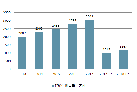 2017 年全年我國(guó)共進(jìn)口管道氣3043 萬(wàn)噸(約合 408 億立方米)。