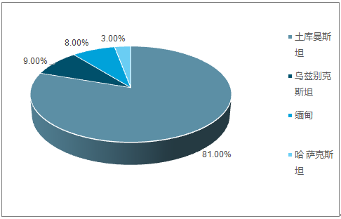 我國(guó)的進(jìn)口管道氣主要來自于土庫(kù)曼斯坦, 2017年我國(guó)從土庫(kù)曼斯坦共進(jìn)口管道氣 2451 萬(wàn)噸(約合 328 億立方米),占去年管道氣進(jìn)口總量的 80.5%,其次烏茲別克斯坦、緬甸、哈薩克斯坦也是我國(guó)的管道氣進(jìn)口國(guó)