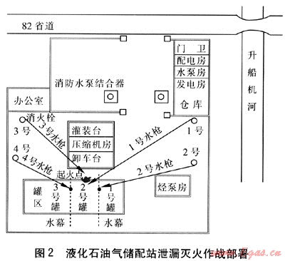 ② 消防作業(yè)組人員立即啟動消防水系統(tǒng),對所有儲罐進行持續(xù)冷卻,同時用大量的噴霧水流驅散站內的液化石油氣蒸氣云。