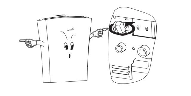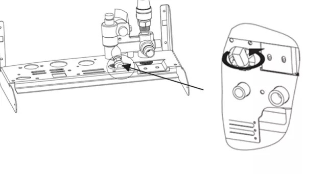 3、逆時針旋轉(zhuǎn)注水/補水閥一周(如下圖),并觀察壁掛爐面板水壓表的指針位置,水會從采暖系統(tǒng)經(jīng)過補水閥通道倒流到熱水出口,如果水壓表指針回到1.5bar以下時,順時針旋轉(zhuǎn)關(guān)閉注水/補水閥。