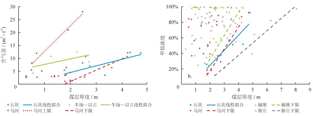 含氣量與煤厚大體上呈正相關(guān)關(guān)系,部分礦區(qū)含氣量與煤厚呈較明顯的線(xiàn)性正相關(guān)關(guān)系,如石坎礦區(qū)(相關(guān)系數(shù)R 為0.6)。較常見(jiàn)的情況是含氣量與煤層厚度之間存在一定的離散性,但其中煤層厚度與含氣量上限及含氣量下限同時(shí)存在較明顯的線(xiàn)性關(guān)系,如馬河礦區(qū)(圖5-a)。甲烷濃度的下限與煤厚普遍表現(xiàn)為正相關(guān)關(guān)系,反映煤層厚度的增加有助于煤層氣的保存(圖5-b)??傊簩雍穸炔粌H控制了煤儲(chǔ)層的生氣潛力,對(duì)煤層氣保存也有一定影響,在煤層頂?shù)装灞4鏃l件不理想的情況下,煤層厚度對(duì)含氣量的影響更為顯著。