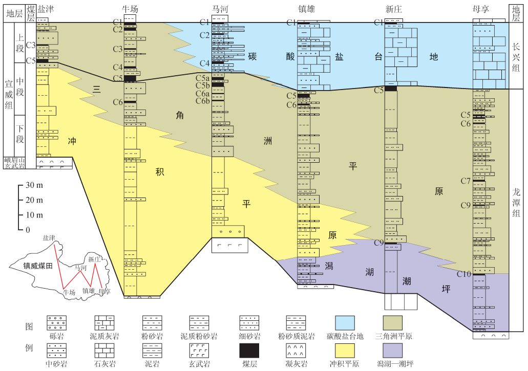 圖2 鎮(zhèn)威煤田上二疊統(tǒng)沉積相及煤層分布示意圖