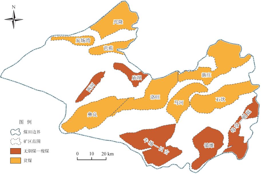 鎮(zhèn)威煤田煤變質(zhì)程度相對(duì)較高,煤類(lèi)以瘦煤、貧煤和無(wú)煙煤為主,揮發(fā)分含量介于2% ~ 28%,鏡質(zhì)組最大反射率介于1.95% ~ 2.74%。受構(gòu)造作用影響[13],最大變質(zhì)程度分別達(dá)到貧煤與無(wú)煙煤的礦區(qū)表現(xiàn)為近東西向條帶在南北方向相間分布,無(wú)煙煤主要分布于母享—則底、鎮(zhèn)雄、牛場(chǎng)—以古以及兩河、廟壩礦區(qū),貧煤主要分布在石坎、新莊、馬河、彝良、洛旺以及興隆、炭場(chǎng)灣、芭蕉礦區(qū)(圖8)。