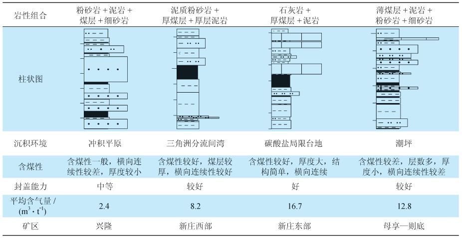 龍?zhí)督M主要為海陸過(guò)渡相沉積,包括三角洲平原、潮坪沉積相。長(zhǎng)興組主要為海相沉積,以碳酸鹽潮下帶為主,煤層頂?shù)装鍘r性組合包括沖積平原中的粉砂巖+泥巖+煤層+細(xì)砂巖、碳酸鹽局限臺(tái)地中的石灰?guī)r+厚煤層+泥巖、三角洲間灣中的泥質(zhì)粉砂巖+厚煤層+厚層泥巖以及潮坪中的薄層煤層+泥巖+粉砂巖+細(xì)砂巖(表2)??傮w上,海陸過(guò)渡相沉積封蓋能力較強(qiáng),陸相沉積封蓋能力較弱,符合常見(jiàn)沉積體系與封蓋體系之間的關(guān)系[20-21]。