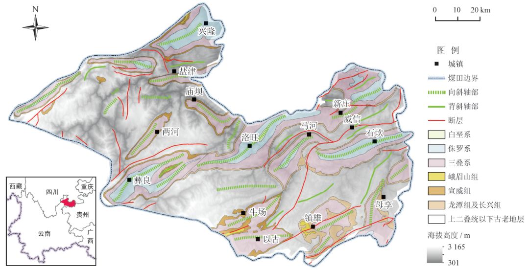 鎮(zhèn)威煤田地理位置位于云南省東北部,北接川南煤田,東臨黔西北煤田,東西長(zhǎng)約125 km,南北寬約120 km,面積約為10 800 km2(圖1)。大地構(gòu)造位置位于古揚(yáng)子板塊西南緣,中二疊世末期上揚(yáng)子地區(qū)在東吳運(yùn)動(dòng)中結(jié)束茅口期陸表海環(huán)境,再次整體抬升為陸地,中二疊統(tǒng)茅口組石灰?guī)r遭受風(fēng)化作用形成廣泛分布的殘積平原[11]。中、晚二疊世之交峨眉山玄武巖大規(guī)模噴溢[12],向東波及至小江斷裂帶,其厚度整體由西向東逐漸變薄,形成了滇東—黔西地區(qū)上二疊統(tǒng)含煤巖系的沉積基底。后期燕山運(yùn)動(dòng)和喜馬拉雅運(yùn)動(dòng)使得現(xiàn)今煤田構(gòu)造以北東—北東東向隔擋式褶皺為主要特征,向斜較寬緩,背斜較緊密,各向斜構(gòu)造幾乎均具北西翼陡而南東翼緩的特點(diǎn)。斷裂構(gòu)造相對(duì)發(fā)育較差,以北東向?yàn)橹?,北西、北北西向次之,擠壓逆沖斷層占主導(dǎo)地位[13](圖1)。