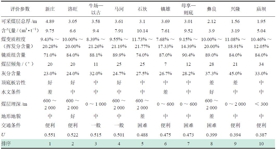 根據(jù)表4 建立的評(píng)價(jià)參數(shù)權(quán)重體系對(duì)鎮(zhèn)威煤田中新莊、石坎、母享—則底、鎮(zhèn)雄等10 個(gè)礦區(qū)的煤層氣勘探潛力指數(shù)U 進(jìn)行計(jì)算,結(jié)果表明有4 個(gè)礦區(qū)具有較好的勘探潛力(U > 0.5),其中新莊礦區(qū)煤層氣開(kāi)發(fā)潛力最好,其次為洛旺礦區(qū)、牛場(chǎng)—以古礦區(qū)和馬河礦區(qū),其他礦區(qū)開(kāi)發(fā)潛力相對(duì)較差,如表5 所示。