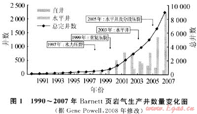 開發(fā)技術(shù)的創(chuàng)新尤其是水平井鉆井、壓裂技術(shù)以及裂縫綜合診斷技術(shù)的進(jìn)步與廣泛運(yùn)用在推動沃斯堡盆地Barnett頁巖氣藏的快速發(fā)展中起著至關(guān)重要的作用。1981年,Barnett頁巖區(qū)在按計劃鉆探過程中偶然發(fā)現(xiàn)顯示良好的Barnett頁巖層段。自1981年第一口發(fā)現(xiàn)井到1992年歷經(jīng)10a生產(chǎn)井僅99口,開發(fā)緩慢。1997年后,水力壓裂開始取代凝膠壓裂成為頁巖氣主要的增產(chǎn)措施,Barnett頁巖氣的開發(fā)也隨之加快了前進(jìn)的步伐。隨著1999年重復(fù)壓裂、2003年水平鉆井以及2005年水平井分段壓裂等一系列新技術(shù)的廣泛運(yùn)用,Barnett頁巖氣發(fā)展速度驚人(圖2),從1997~2007年的10a時間里,Barnett頁巖氣區(qū)有多達(dá)8629口頁巖氣井投入生產(chǎn)(其中水平井4973口,占50%以上)。新技術(shù)的運(yùn)用同樣使Barnett頁巖氣產(chǎn)量發(fā)生了翻天覆地的變化,截至2008年1月,Barnett頁巖氣產(chǎn)量約0.996×108m3/d,累計產(chǎn)量1044.9×108m3[3]。