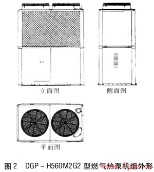該公司燃?xì)鉄岜每照{(diào)制冷系統(tǒng)見圖1。根據(jù)該公司基本情況,選用DGP-H560M2G2型燃?xì)鉄岜脵C(jī)組,安裝在屋頂,該機(jī)組長(zhǎng)為1.800m,寬為1.060m,高為2.248m,質(zhì)量為840kg。該型號(hào)燃?xì)鉄岜脵C(jī)組的技術(shù)參數(shù)見表1,其外形見圖2。