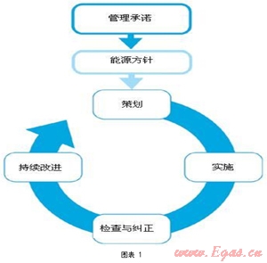 用能企業(yè)是實(shí)現(xiàn)能源節(jié)約的核心。在以節(jié)能減排為重要目標(biāo)的指引下,企業(yè)使用任何能源,都應(yīng)制定一個基本的控制程序,形成一個有效能源管理體系運(yùn)行模式。企業(yè)為兌現(xiàn)管理承諾和實(shí)現(xiàn)能源方針應(yīng)進(jìn)行策劃-實(shí)施-檢查與糾正-持續(xù)改進(jìn)(PDCA)等過程。圖示如下(圖表1):