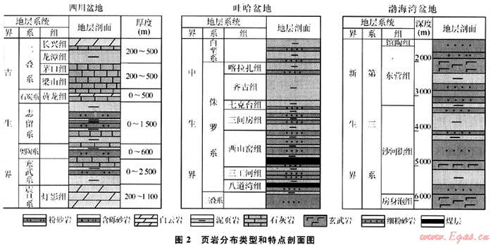 1) 在從寒武紀(jì)到第四紀(jì)的540Ma地質(zhì)時(shí)期內(nèi),延續(xù)形成了從海相、海陸過渡相到陸相等多種沉積環(huán)境條件下的10余套富含有機(jī)質(zhì)及頁巖氣資源潛力的泥頁巖系,它們平面分布廣、剖面層位多、累計(jì)厚度大,構(gòu)成了中國頁巖氣發(fā)育的強(qiáng)大物質(zhì)基礎(chǔ)。經(jīng)過后期多次的構(gòu)造運(yùn)動改造,顯現(xiàn)出頁巖構(gòu)造變動強(qiáng)、保存模式多、埋深變化大等特點(diǎn)。
