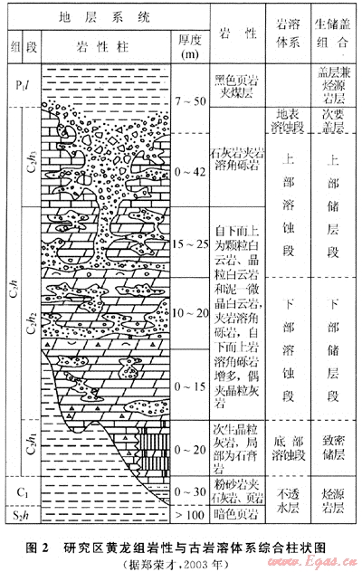 位于四川盆地東部的渝北-鄰水地區(qū)在范圍上包括重慶市的渝北區(qū)、北碚區(qū)和四川省的鄰水縣與華鎣山市,面積約3900km2(圖1)。上石炭統(tǒng)黃龍組為該地區(qū)天然氣主要產(chǎn)層,儲(chǔ)層屬于古巖溶成因類型[5~7],區(qū)內(nèi)發(fā)育有鄰北、板東、板橋、座洞崖、銅鑼?shí){、相國(guó)寺和環(huán)山等眾多次一級(jí)構(gòu)造控制的黃龍組氣藏,具備很大的勘探開(kāi)發(fā)潛力。研究區(qū)石炭系受海西早期強(qiáng)烈構(gòu)造隆封和侵蝕作用,只殘存了不完整的上石炭統(tǒng)黃龍組拱不整合超覆在中志留統(tǒng)韓家店組暗色泥頁(yè)巖之上,頂面被下二疊統(tǒng)梁山組煤系地層超覆,自下而上被劃分為3個(gè)巖性和巖相截然不同的巖性段[8](圖2)。
