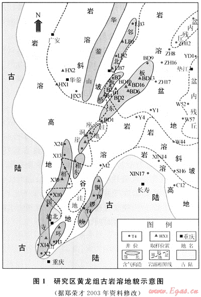 碳酸鹽礦物鍶同位素地球化學(xué)特征是碳酸鹽巖成因分析最重要的證據(jù)之一[1~2],近年來(lái)國(guó)外將鍶同位素地球化學(xué)特征廣泛地應(yīng)用于碳酸鹽巖石學(xué)、巖相古地理和儲(chǔ)層地質(zhì)學(xué)等研究領(lǐng)域中,而將其應(yīng)用到碳酸鹽巖古巖溶儲(chǔ)層中的成果則很少[3~4]。筆者僅就渝北-鄰水地區(qū)上石炭統(tǒng)黃龍組古巖溶儲(chǔ)層的鍶同位素特征對(duì)巖溶過(guò)程的流體性質(zhì)和古水文條件展開(kāi)討論,為預(yù)測(cè)和評(píng)價(jià)此類儲(chǔ)層提供有關(guān)的地質(zhì)-地球化學(xué)信息。