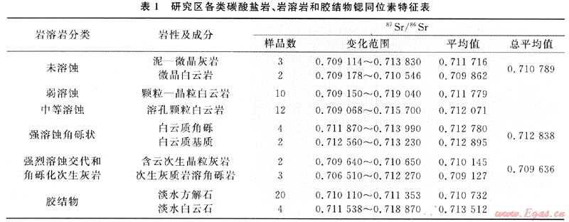 包括未溶蝕的正常海相泥-微晶灰?guī)r和薩勃哈環(huán)境的微晶白云巖,此兩類樣品的分析結(jié)果,主要用作為代表地層鍶同位素背景值和描述與對(duì)比巖溶巖系溶蝕過(guò)程中鍶同位素變化規(guī)律的參照物。
