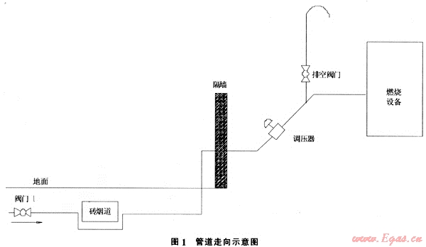 管道概況:新建管道長約200m,設(shè)計(jì)壓力為0.4MPa。從一支線閥門井用de110的PE管道接出后埋地鋪設(shè),途中從一地下磚制煙道下方下翻穿越,之后穿出地面改為DN100鋼制管道進(jìn)入車間,經(jīng)調(diào)壓、計(jì)量后接入燃燒設(shè)備(圖1)。管道建成后經(jīng)過空氣強(qiáng)度和氣密性試驗(yàn)合格。