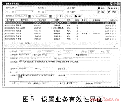 設(shè)置業(yè)務(wù)有效性界面見圖5,大慶燃氣客戶服務(wù)系統(tǒng)采用先進的CTI技術(shù),友好的語音導(dǎo)航服務(wù)提高了服務(wù)質(zhì)量;電話接入后系統(tǒng)可自動定位客戶,實現(xiàn)客戶數(shù)據(jù)與電話的同步轉(zhuǎn)移,大大提高了坐席的工作效率和服務(wù)水平;可實現(xiàn)客戶發(fā)送傳真的自動接收,支持人工在線派發(fā)和處理,提高了效率,降低了運營成本,可以滿足將來不斷發(fā)展的燃氣客戶業(yè)務(wù)需求。該系統(tǒng)的具體功能如下: