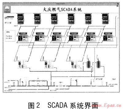 ② 數(shù)據(jù)存儲、分析和處理。SCADA系統(tǒng)界面見圖2,對高于上限或低于下限的實時數(shù)據(jù)做出超高、超低報警;根據(jù)需要提供生產(chǎn)數(shù)據(jù)報表,還提供趨勢圖,用以輔助分析用氣規(guī)律;系統(tǒng)提供了7種不同功能的使用權(quán)限,使操作員和維護人員可以根據(jù)使用需求更方便地進行工作;系統(tǒng)具有事件記錄功能,無論是實時數(shù)據(jù)報警還是通信故障,一切信息都作為事件被記錄在系統(tǒng)中,以供日后查看。