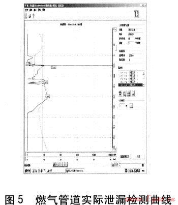 2004年元月2日,對(duì)呼和浩特市新建西街的燃?xì)夤芫W(wǎng)進(jìn)行檢漏,當(dāng)車行駛在新建西街上,報(bào)警聲響起,電腦屏幕立即顯示,發(fā)現(xiàn)了有燃?xì)庑孤┑牡胤?。圖4是燃?xì)夤艿缹?shí)際泄漏檢測(cè)數(shù)據(jù)表。為了真實(shí)還原這次燃?xì)庑孤z查的全過程,從實(shí)際記錄的預(yù)覽檢測(cè)圖中,可以看到該次檢測(cè)的檢測(cè)結(jié)果和其他信息。圖5是燃?xì)夤艿缹?shí)際泄漏檢測(cè)曲線。