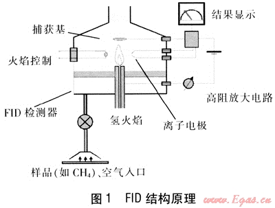 Harley等人于1958年研制成功氫火焰離子化檢測(cè)器(Hydrogen Flame Ionization Detector,F(xiàn)ID)[2]。它的基本原理是以氫氣和氮?dú)獾幕旌蠚庠诳諝庵腥紵傻幕鹧鏋槟茉?,?dāng)碳?xì)溆袡C(jī)化合物進(jìn)入氫氣和氧氣燃燒室的火焰中時(shí),在高溫的作用下,產(chǎn)生化學(xué)電離反應(yīng),電離產(chǎn)生比基流高幾個(gè)數(shù)量級(jí)的離子,在較高直流電場(chǎng)的定向作用下,形成離子流,微弱的離子流(10-12~10-8A)產(chǎn)生與進(jìn)入火焰的碳?xì)溆袡C(jī)化合物量成正比的電流信號(hào),因而電流信號(hào)與被測(cè)碳?xì)溆袡C(jī)化合物(如甲烷CH4)的體積分?jǐn)?shù)成正比,體積分?jǐn)?shù)為1×10-6所對(duì)應(yīng)的電流約為500fA。經(jīng)過高阻電路(電阻為106~1011Ω)放大后形成電壓信號(hào),此電壓能換算成被測(cè)氣體的體積分?jǐn)?shù)。FID結(jié)構(gòu)原理見圖1。