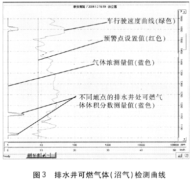 采用車載FID檢測(cè)系統(tǒng)對(duì)排水井可燃?xì)怏w(沼氣)檢測(cè)曲線見圖3。