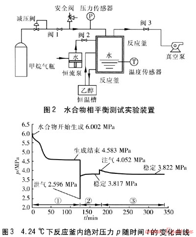 在恒定的反應(yīng)釜容積下,保持實(shí)驗(yàn)溫度不變,使水過(guò)量,充入甲烷,使反應(yīng)釜內(nèi)初始?jí)毫Ω哂趯?shí)驗(yàn)溫度所對(duì)應(yīng)的平衡壓力。當(dāng)有水合物生成,且反應(yīng)釜內(nèi)壓力不再下降時(shí),穩(wěn)定1~3h之后,將反應(yīng)釜內(nèi)壓力泄至實(shí)驗(yàn)溫度對(duì)應(yīng)的平衡壓力以下,此時(shí)水合物大量分解,壓力開(kāi)始上升。當(dāng)壓力不再上升時(shí),穩(wěn)定1~3h,再充入甲烷,升壓至實(shí)驗(yàn)溫度對(duì)應(yīng)的平衡壓力以上,使水合物再次生成。如此反復(fù)幾次,取其值最接近的升壓后的壓力值和降壓后的壓力值的平均值,作為該溫度下的水合物相平衡壓力值。