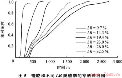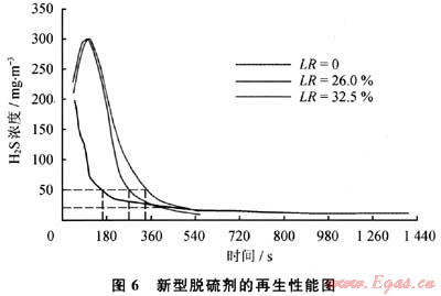 我國GB 17820一1999《天然氣》規(guī)定,城市管道天然氣中硫化氫含量標準為:一類天然氣中硫化氫含量不大于6mg/m3,二類天然氣中硫化氫含量不大于20mg/m3,三類天然氣中硫化氫含量小于460mg/m3。而GB 18047—2000《車用壓縮天然氣》規(guī)定,車用壓縮天然氣中硫化氫含量不大于15mg/m3。由圖5可以看出,LR>14.3%的脫硫劑,硫化氫穿透時間長于300s,即300s內(nèi)產(chǎn)品氣中不含硫化氫,符合一類城市管道天然氣和車用天然氣用氣要求。